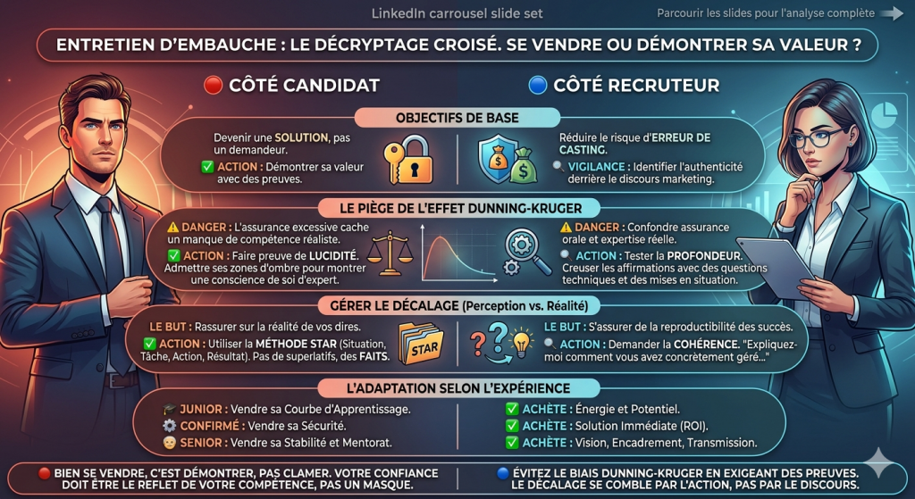 Medium et Welcome to the Jungle prônent la nuance. Se vendre, oui, mais avec humilité. Ils citent une méthode admettre vos zones a renforcer. Un candidat capable de dire « je ne sais pas, mais voici comment je l’apprendrais » montre une conscience de soi qui brise instantanément l’effet Dunning-Kruger. C’est le signe d’une expertise réelle.